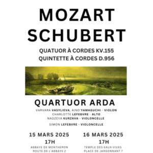 Mozart, Quatuor KV. 155 Le quatuor en ré mineur KV.155 de Wolfgang Amadeus Mozart est une œuvre de jeunesse composée lors d’un voyage avec son père en Italie. Appartenant au cycle des six quatuors milanais, moins connu que le cycle viennois, cette œuvre pleine d’élégance et d’esprit annonce déjà l’exceptionnel talent du jeune compositeur. Schubert, Quintette à deux violoncelles D. 956 En contraste, le fameux quintette à deux violoncelles de Franz Schubert est composé en 1828, soit deux mois avant la mort du compositeur. Il ne sera créé à Vienne qu’en 1850. Le lyrisme de ses phrases, la perfection de sa forme et la couleur grave apportée par le second violoncelle en font une des pièces les plus remarquables du grand répertoire de la musique de chambre du 19ème siècle. Varvara Vasylieva – violon Aino Yamaguchi – violon Charlotte Lefebvre – alto Nadzeya Kurzava – violoncelle Simon Lefebvre – violoncelle ...
